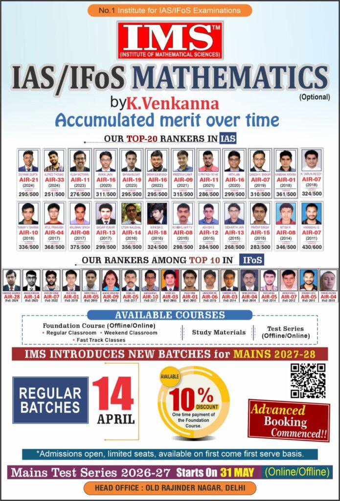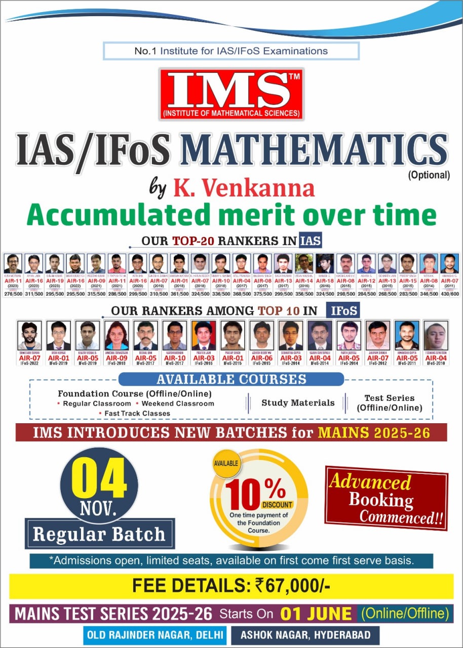 IMS provides India’s best Mathematics optional classroom programme for the UPSC IAS/IFoS Exam. Join Now to crack the upcoming UPSC Maths Optional examination under the guidance of K. Venkanna. Join IMS Advance Mains Maths Optional Test Series for UPSC