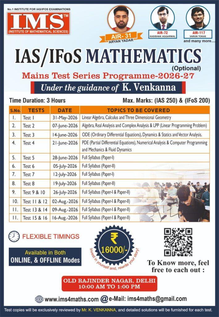 IMS (Institute of Mathematical Sciences) offers comprehensive courses for UPSC Maths optional preparation. We offer the best maths optional mains test series, Maths Optional Fast Track Course, Crash Course for Mathematics Optional, CSAT Test series and GS Test series. Join our best institute for UPSC Maths optional test series now to enhance your UPSC CSE preparation.